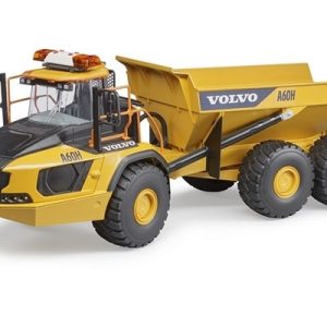 Haulers are true workhorses! Be it to efficiently transport bulk goods as part of earth-moving, asphalt as part of road construction, overburden in quarries and gravel pits, this tipper can rely on its strengths. As one of the most powerful tippers the Volvo A60H has now been added to the BRUDER themed world of construction equipment. Just like the real thing, the model guarantees exemplary off-road capabilities thanks to its solid articulated steering in conjunction with massive balloon tyres. One bworld figure can take a seat through the roof hatch of the extremely modern cab. Young hauler drivers can load and unload the genuine, enormous tipping trough.